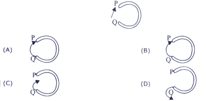 36. The circular groove is kept vertical. A marble is shot into this groove from point P as shown in diagram leaves the groove at Q. Which picture shows how the marble will move when it leaves the groove at Q?
